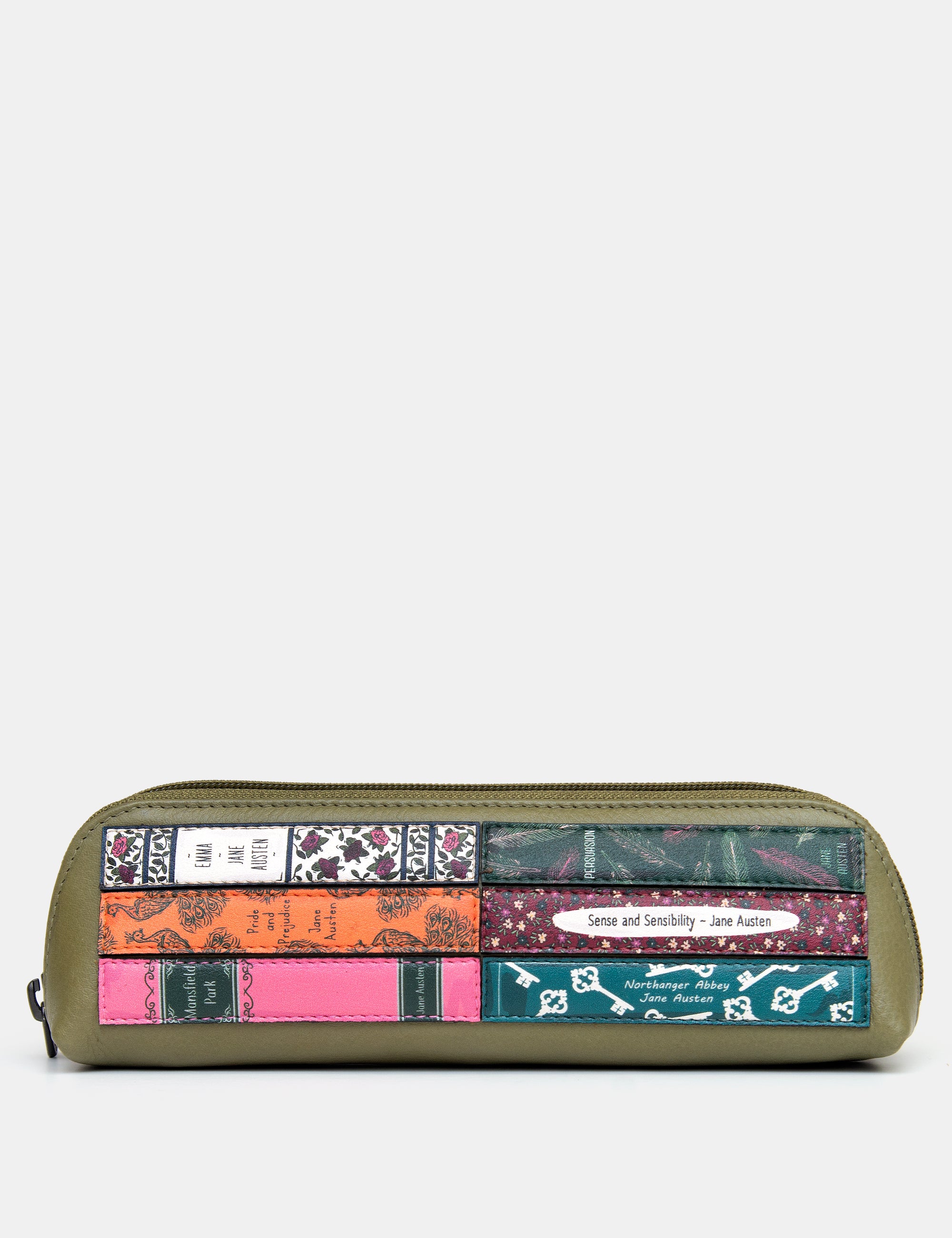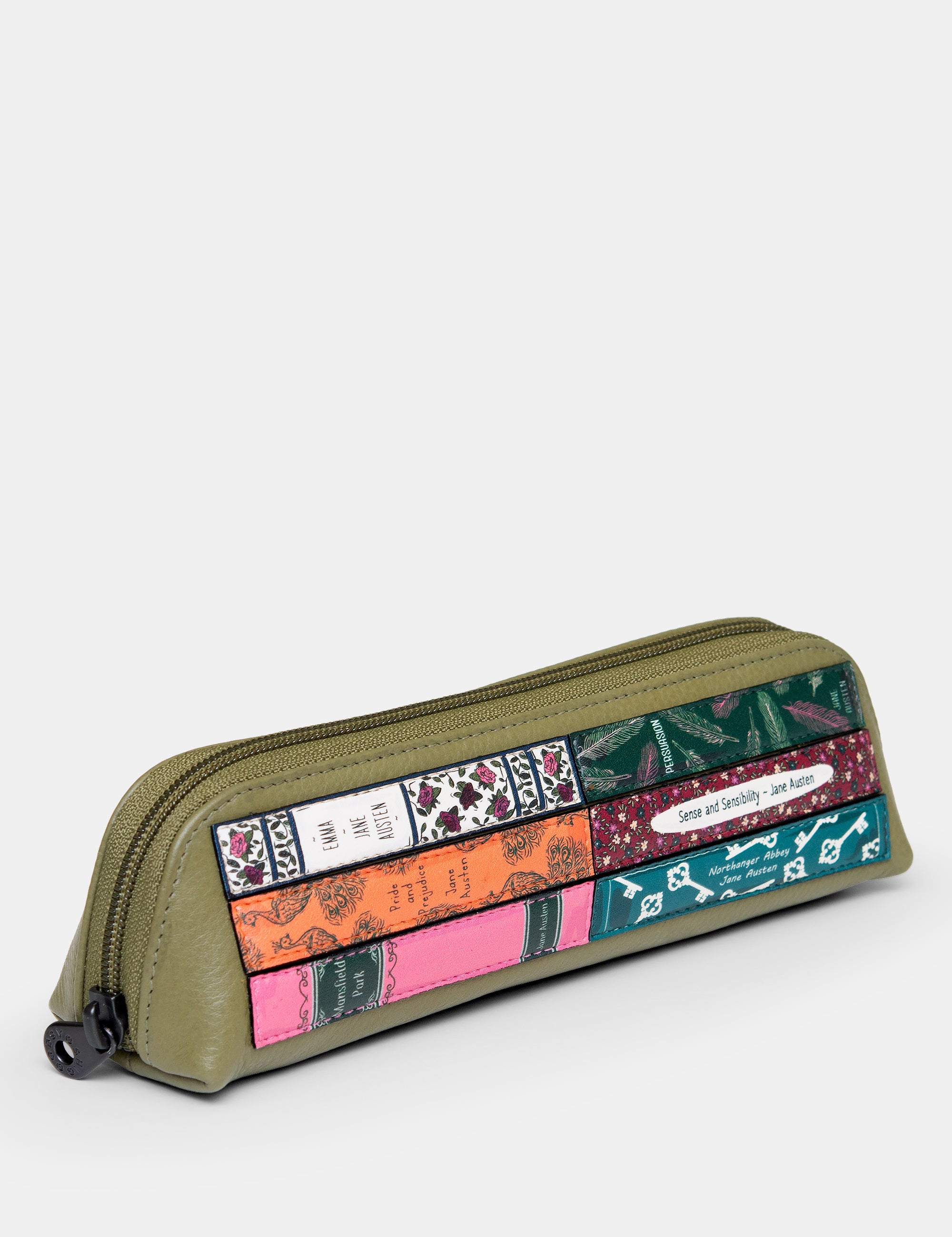Jane Austen Bookworm Library Zip Top Olive Leather Pouch Pencil Case